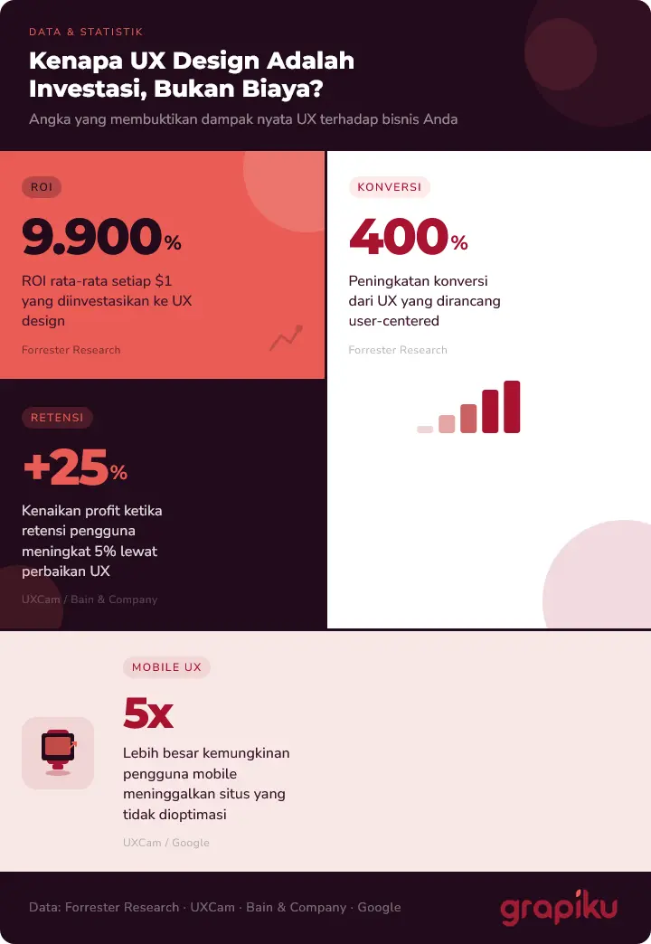 Kalau sebuah website mendapat 1.000 pengunjung per bulan dengan konversi 1%, artinya hanya 10 orang yang menghubungi atau melakukan transaksi. Perbaikan UX yang efektif bisa mengangkat angka itu ke 3 atau 4 persen tanpa harus menambah anggaran iklan sama sekali.